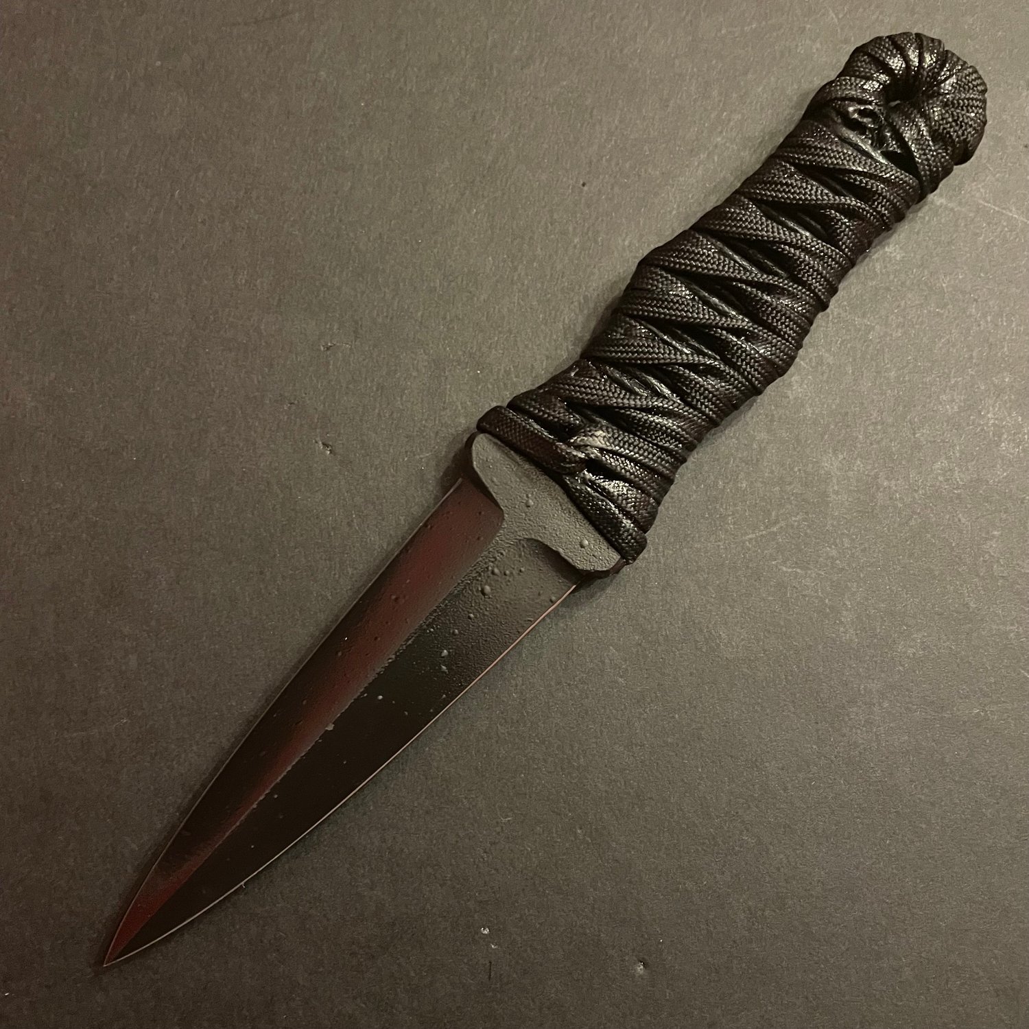 Point-driven dagger, with the same overall length as Gaijin Shuriken. Double edged, blacked out, cord-wrapped, purpose-built. The blade is 80crv2, with hammer textured ricasso, and epoxy stabilized gutted paracord wrap. Kydex "tuck" style sheath with leash and pull-the-dot soft loop included.