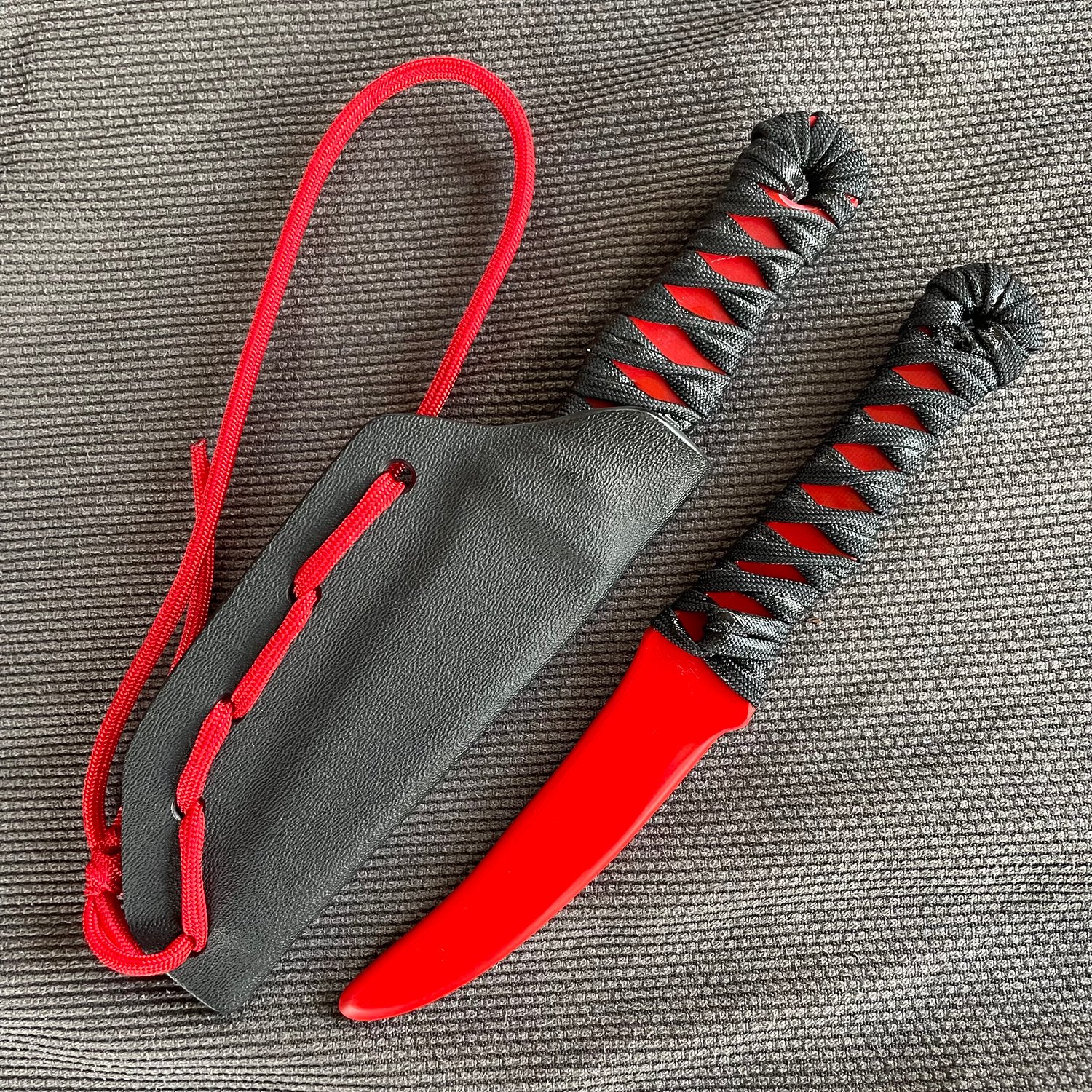 A fully nonmetallic training version of either the Amsvartnir / Arrakis design or the Gaijin Shuriken. Pictured is the dagger option. Red g10 with stabilized black cord wrap. Available with or without a sheath, in matching red kydex with a black leash. These training knives have a rounded, polished “butter knife” tip and are the full length of the models they are based on. Suitable for sparring, or practicing on a bag or dummy.