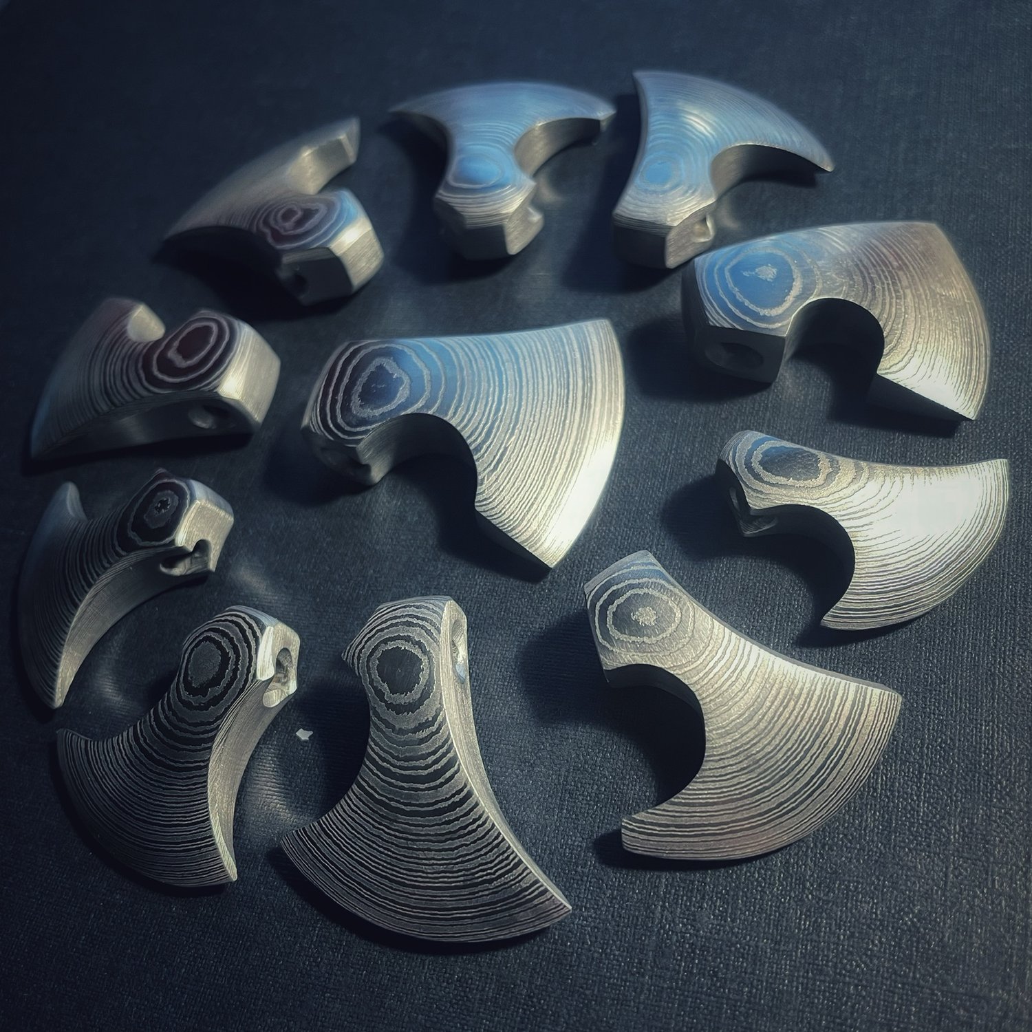 200 layers of tool steel, forge welded under an antique power hammer. Individually shaped, etched, and polished. No two are alike. Alloys are 1095 and 15n20.