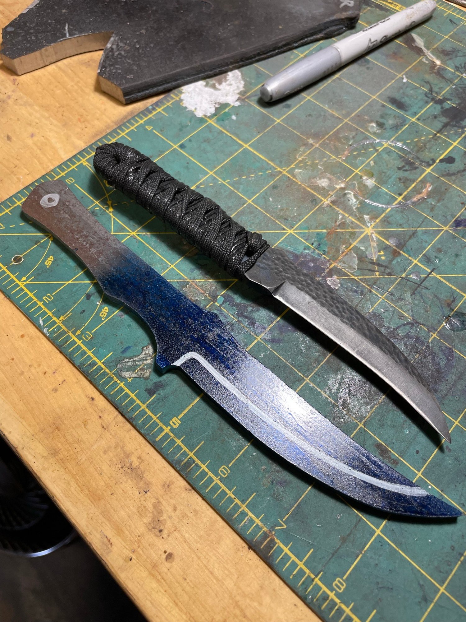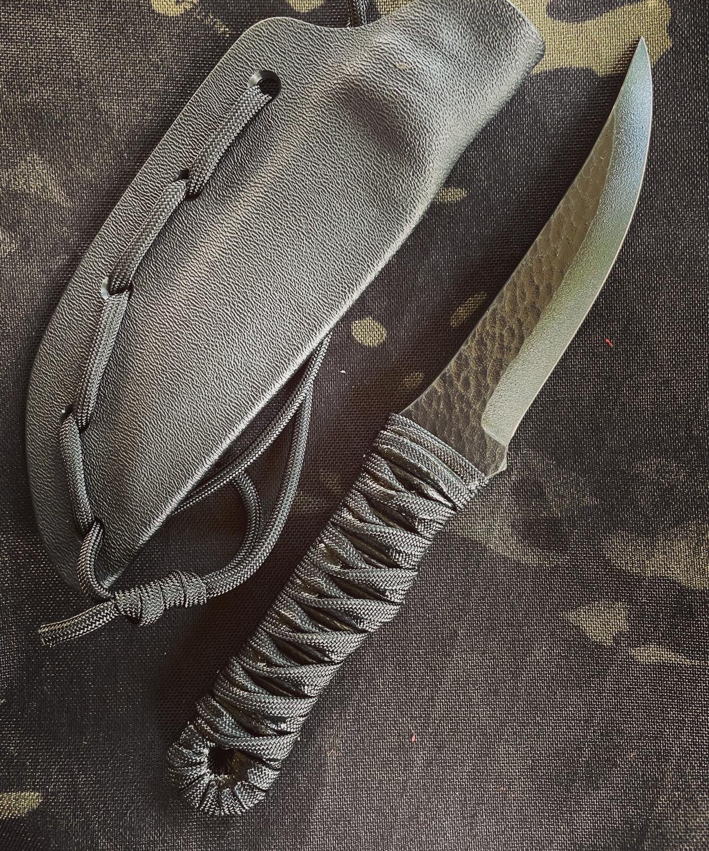 Black Cerakote treated 80crv2 blade with stabilized cord wrap is the default for these. Simple kydex "tuck" sheath with gutted paracord leash and pull-the-dot soft loop for multiple carry options. The hole pattern on all sheaths are now spaced to accommodate molle-loc clips.